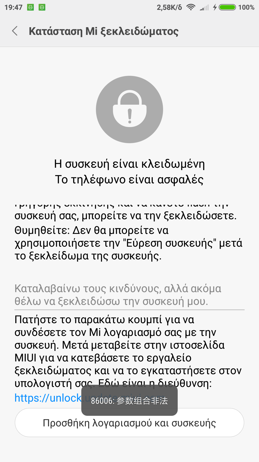 Καλησπέρα σας. Έχω αγοράσει εδω και μια εβδομάδα το πρωτο xiaomi κινητο μου και θελωω να το ξεκλειδωσω. Έχω κανει αίτηση στο site απο την παρασκευη το μεσημερι και μου ηρθε μετα απο μιση ωρα περιπου μνμ το οποιο μου ελεγε: You have been granted the permisision to unlock your device.Download Mi Unlock Tool. Εκανα την διαδικασια και στην εφαρμογη του unlock που τρεχω οταν φτανει στο 99% μου βγαζει το εξης μνμ: Current account is not bound to this device.Τι πρεπει να κανω; περιμενω ακομα να μου ερθει καποιο επιπλεον μνμ απο την xiaomi; Εχω τον ιδιο λογαριασμο σε κινητο και pc να σας πω. Ευχαριστω.