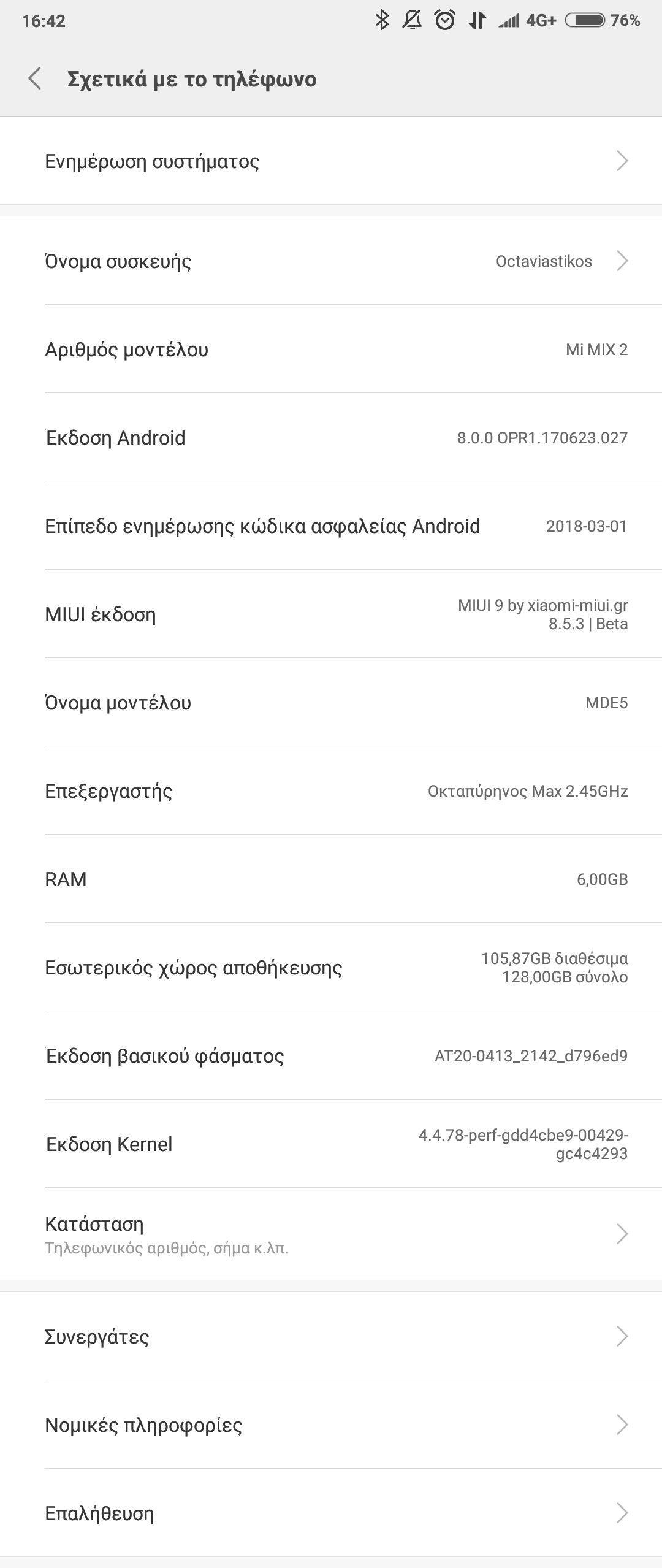 Έβαλα την άρωμα στο mi6 κ από την Κυριακή που την χρησιμοποιώ έχω να πω ότι σε σχέση με την 8.2.1 που είχα πριν κ με την ίδια χρήση η μπαταρία είναι χειρότερη. Εκεί που η μπαταρία έφθανε στις 23:00 στο 11%-13% από το πρωϊ, τώρα με πάει ως το απόγευμα. Με ευχαριστεί που πλέον μπορώ να βάζω δακτυλικό αποτύπωμα σε όσες εφαρμογές το υποστηρίζουν (τράπεζες), λειτουργεί σωστά το tap'n'pay της alpha, το nova go. Δεν υπάρχει το face unlock, θα ήθελα να μπορώ να διαγράψω το gmail. Ωραίος ο τρόπος που εμφανίζονται οι ειδοποιήσεις στην κουρτίνα κ στην οθόνη κλειδώματος.Όταν δέχομαι μνμ στο messeger μου βγάζει ένα εικονίδιο στην γραμμή κατάστασης από το σύστημα android ότι η εφαρμογή messenger επικαλύπτει άλλες. Πως το απενεργοποιούμε αλλά να μας βγάζει τις εικόνες συνομιλητών;Ο/H apo.stam έγραψε: