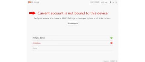 Η έγκριση μπορεί να διαρκέσει έως και 10 ημέρες, αλλά κατά κανόνα, αυτή η διαδικασία διαρκεί πολύ λιγότερο χρόνο. Τις περισσότερες φορές χρειάζεται από 12 έως 24 ώρες. Αφού λάβετε το πολυαναμενόμενο SMS, μπορείτε να προχωρήσετε στο επόμενο στάδιο. 3. ΕΓΚΑΤΑΣΤΑΣΗ ΤΟΥ OFFICIAL FIRMWARE Αυτό το βήμα μπορεί να εκτελεστεί εκ των προτέρων, χωρίς να περιμένετε έγκριση. Προκειμένου το ξεκλείδωμα να είναι επιτυχές, πρέπει να εγκαταστήσετε την πιο πρόσφατη έκδοση της MIUI ROM . Τις τελευταίες εκδόσεις αυτού του υλικολογισμικού μπορείτε να κατεβάσετε πάλι από το επίσημο site της Miui για το Redmi 5 Κίνα η Redmi 5 Plus Κίνα 4. ΞΕΚΛΕΙΔΩΜΑ ΤΟΥ BOOTLOADER Αφού λάβετε την έγκριση από τον κατασκευαστή, το πρώτο πράγμα που πρέπει να κάνετε είναι να ελέγξετε αν αυτό το smartphone είναι συνδεδεμένο με έναν λογαριασμό MI. Αν αυτό δεν γίνει, τότε κατά το ξεκλείδωμα του bootloader στο πρόγραμμα "ξεκλείδωμα miflash" θα εμφανιστεί το ακόλουθο σφάλμα.