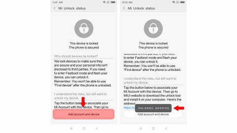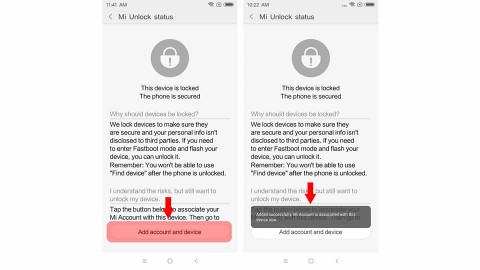 Για να το φτιάξουμε αυτό, μεταβαίνουνε στο στοιχείο: "Mi Unlock status" - "Ελέγξτε αν η συσκευή είναι κλειδωμένη". Έχουμε ήδη περιγράψει πώς να το κάνουμε (τρόπος 1). Για να δεσμεύσετε, κάντε κλικ στην επιλογή "Προσθήκη λογαριασμού και συσκευής". Μετά από λίγα δευτερόλεπτα, θα πρέπει να υπάρχει μια επιγραφή: "Προστέθηκε με επιτυχία ......"