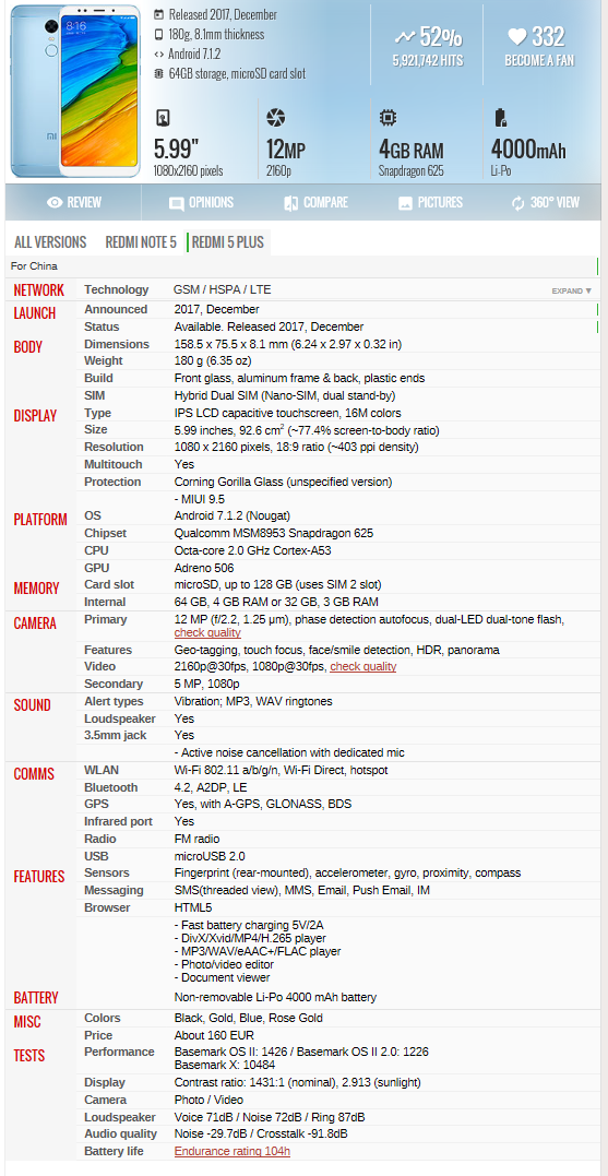 Τεχνικά Χαρακτηριστικά Redmi 5 Plus/ Redmi 5 Plus Global Version