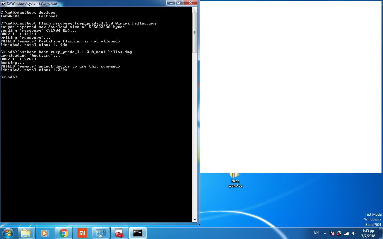 Καλησπέρα σε όλους. Κάτοχος Redmi 4 Prada με παρόμοιο πρόβλημα , ακολούθησα τα βήματα που αναφέρονται πιο πάνω αλλά στο παράθυρο εντολών βλέπω αυτήν την εικόνα . Έχει κανείς καμιά ιδέα ?