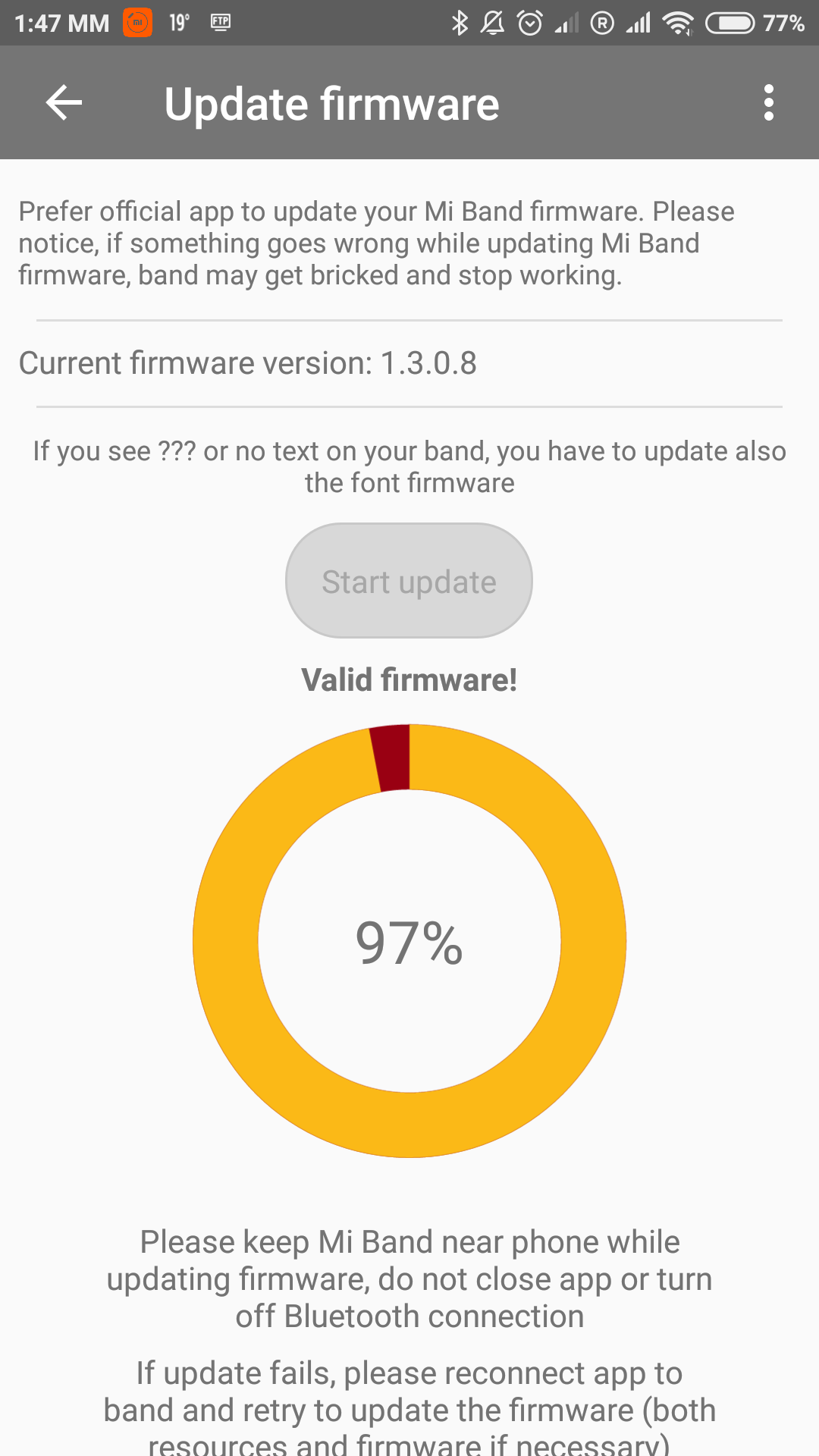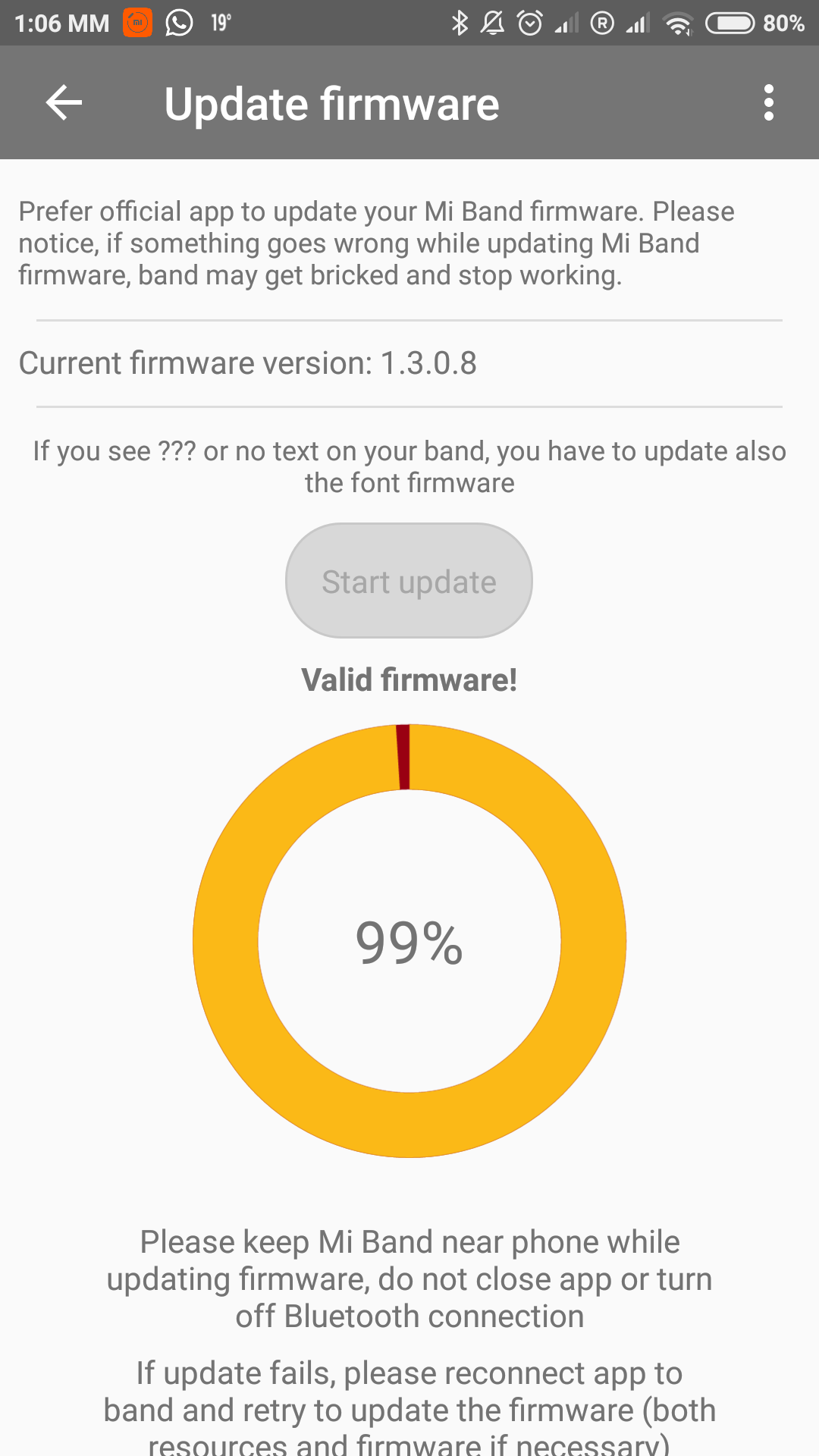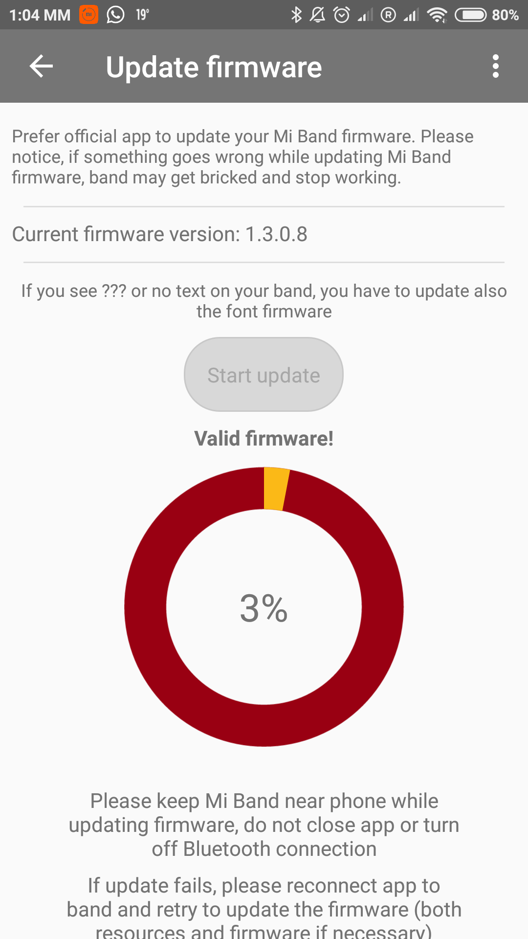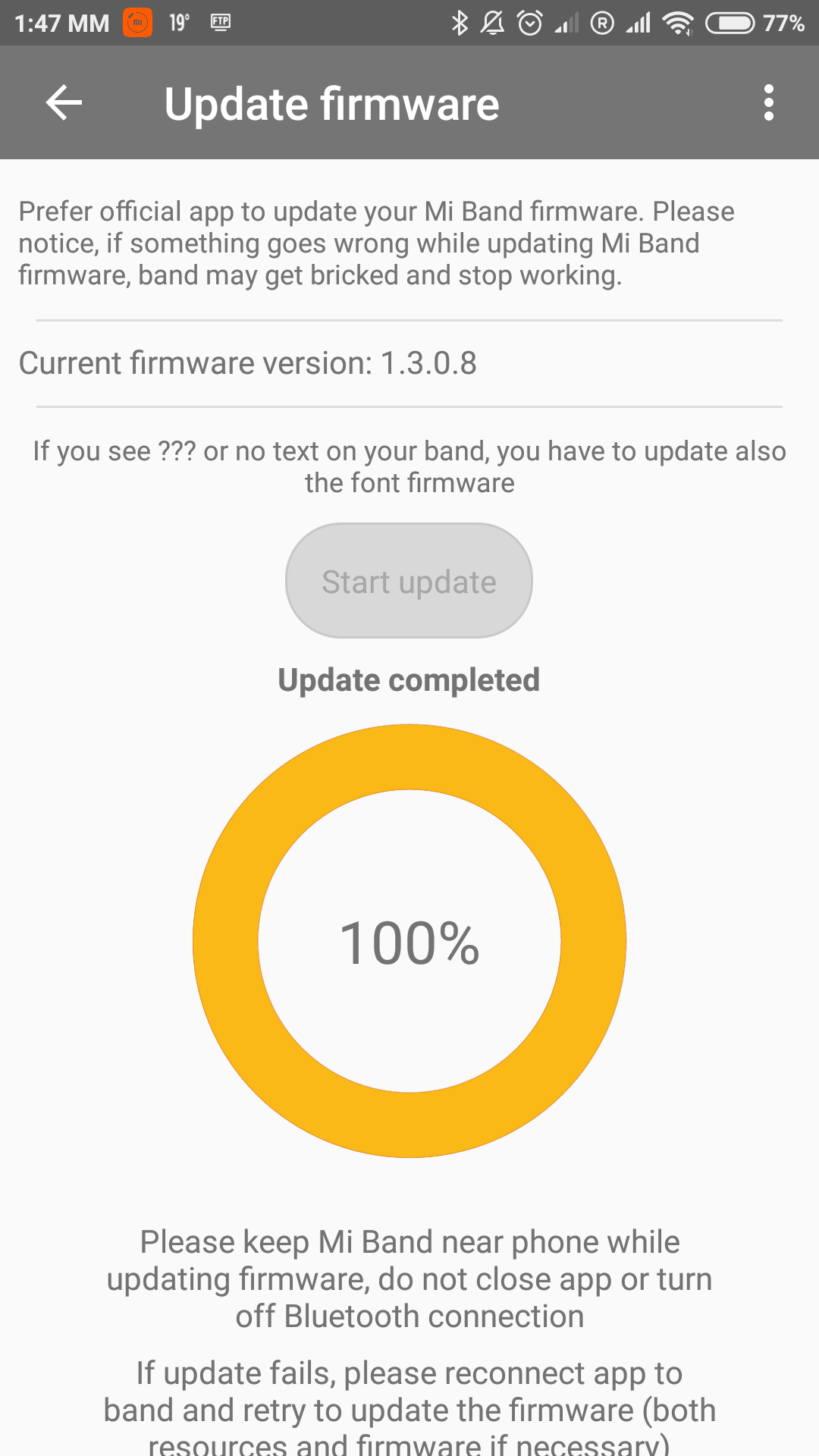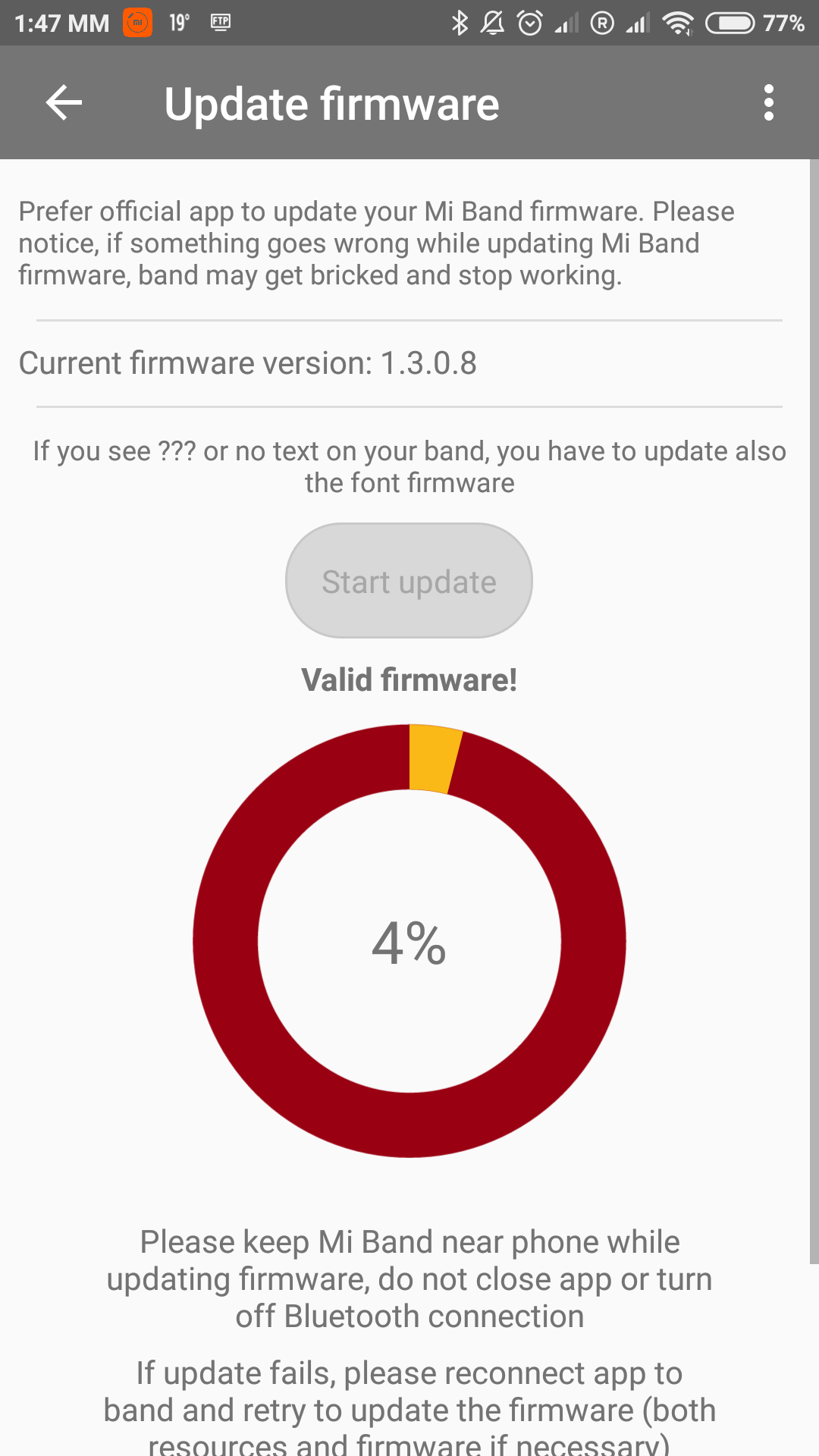 9) Το Update θα αρχίσει όπως βλέπετε και στις παρακάτω φωτογραφίες. Υπομονή για να ολοκληρωθεί και να περαστεί με επιτυχία. Κρατήστε όσο πιο κοντά μπορείτε το κινητό στο Mi Band, μην κλείσετε την εφαρμογή ή το Bluetooth και γενικά μη κόψετε τη διαδικασία για κανένα λόγο.