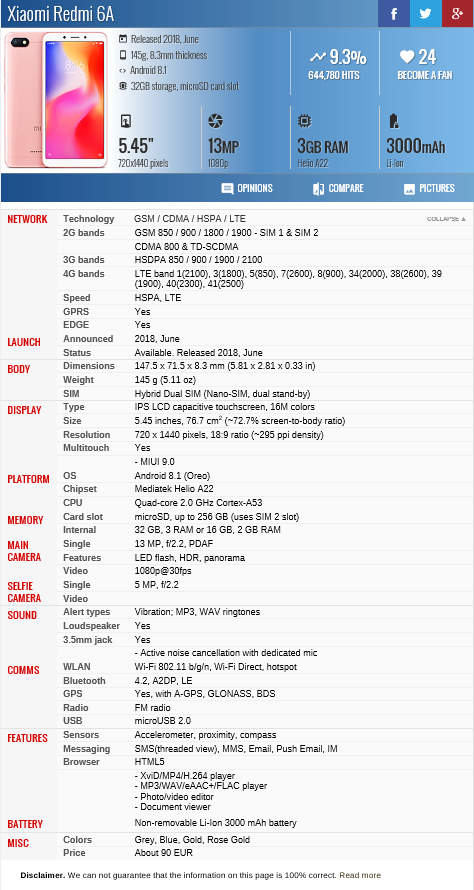 Τεχνικά Χαρακτηριστικά Redmi 6A (Cactus)