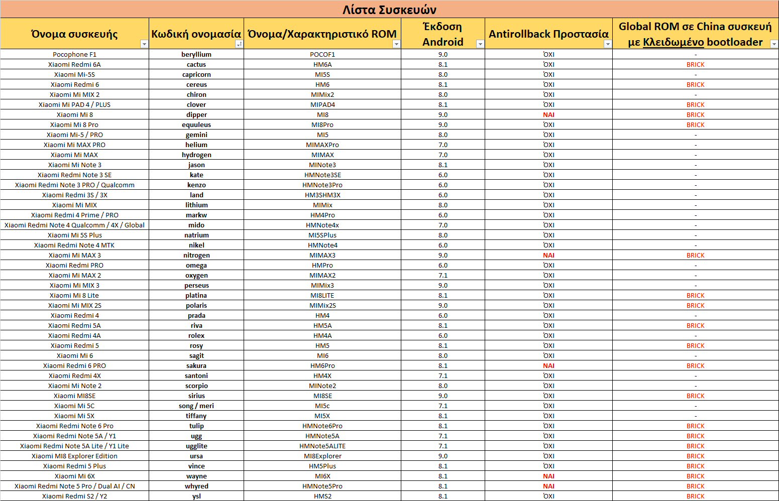 ποιες συσκευές Xiaomi έχουν ενεργοποιημένο το Anti Roll Back
