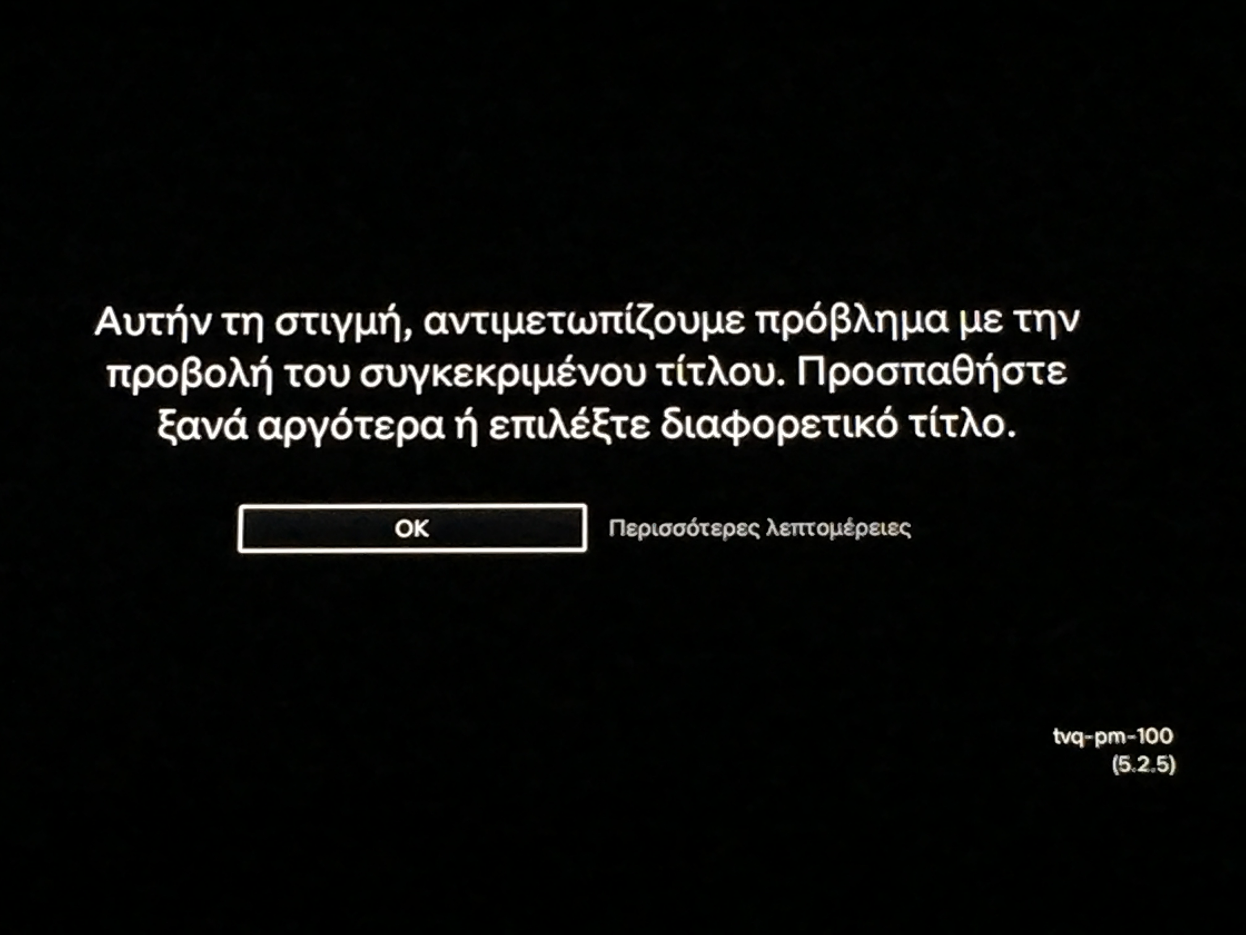 Καλησπερα παιδιά.θα ήθελα να ρωτήσω κάτι.προσπαθω να δω Netflix στο mibox S που πήρα πρόσφατα και προκύπτει το εξής πρόβλημα: όταν βάζω να παίξουν μερικοί τίτλοι στο φόρτωμα ανεβαίνει 1-1 % μέχρι το 24% και μου βγάζει το εξής μήνυμα « αυτήν τη στιγμή αντιμετωπίζουμε πρόβλημα με την προβολή του συγκεκριμένου τίτλου. Προσπαθήστε ξανά αργότερα ή επιλέξτε διαφορετικό τίτλο». Τι επανεκκινήσεις έκανα, τι επαναφορά ρυθμίσεων , τι αλλαγή ρυθμίσεων στην ανάλυση, τι έλεγχο δικτύου• το πρόβλημα παραμένει. Το θέμα μου είναι ότι αλλους τίτλους τους παίζει κ αλλους όχι. Γνωρίζει κανεις τπτα σχετικό;