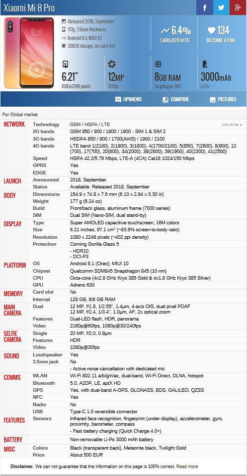 Τεχνικά Χαρακτηριστικά Mi 8 PRO (Equuleus)​