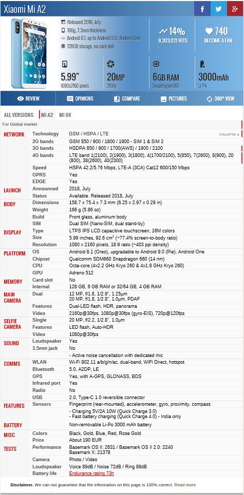 Τεχνικά Χαρακτηριστικά Mi A2 (Jasmine)