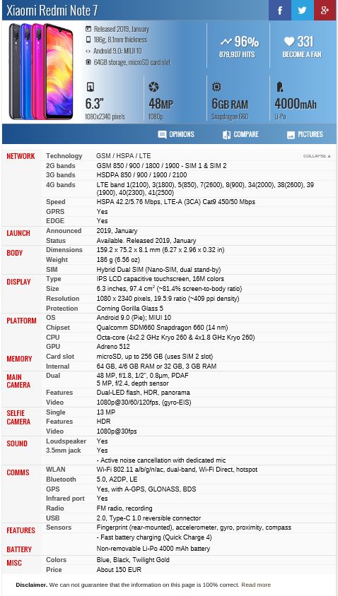 Τεχνικά Χαρακτηριστικά Redmi Note 7 (Lavender)