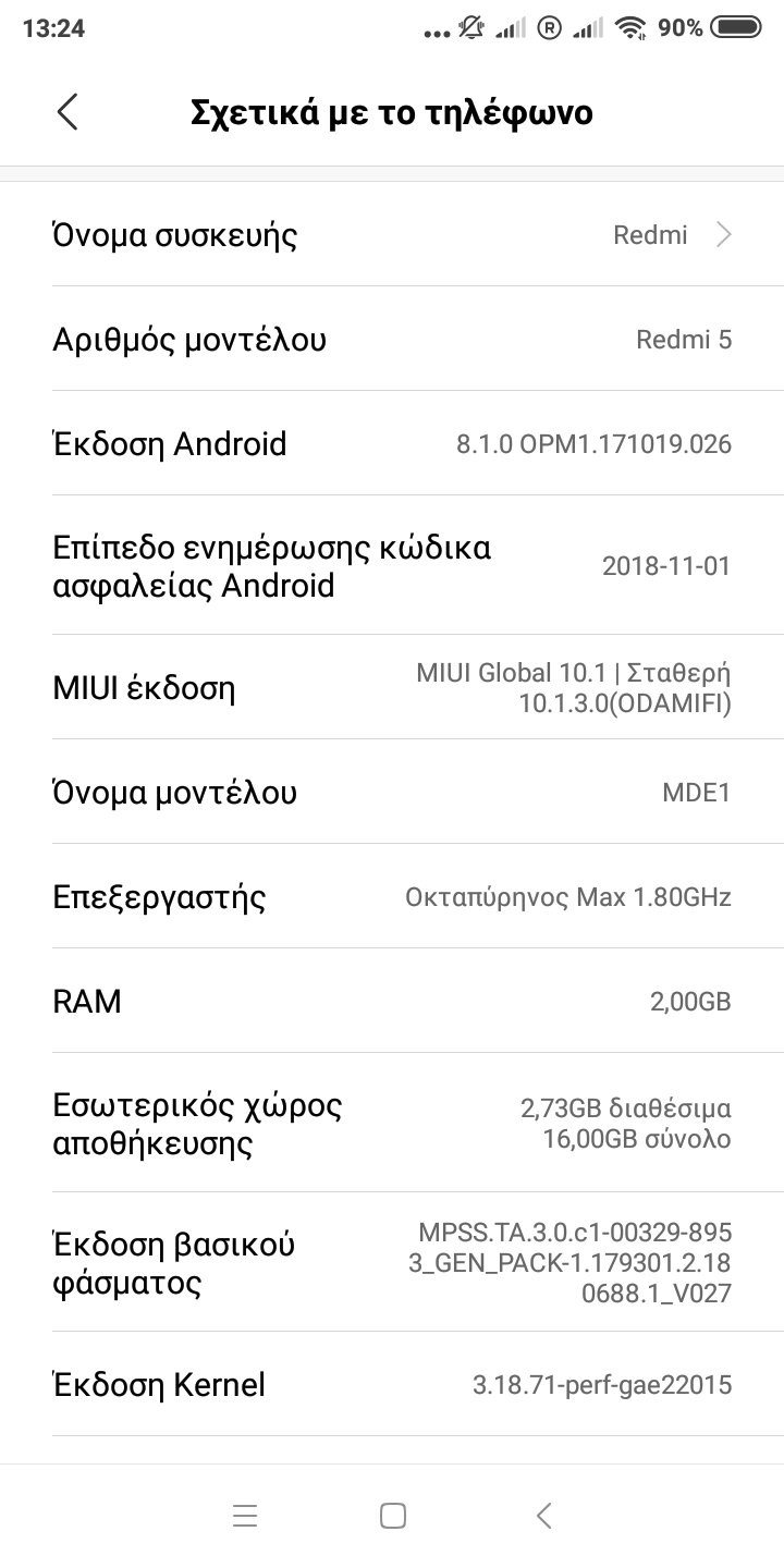Καλησπέρα σας! Έχω ένα Xiaomi Redmi 5 το οποίο αγοράστηκε τον Ιούνιο του 2018 με MIUI 9. Αυτό που με προβληματίζει είναι ότι δεν έχει ενημερωθεί σε MIUI 10 αν και είδα ότι βγήκε η σχετική ενημέρωση γι'αυτό το μοντέλο. Η αλήθεια είναι ότι αγοράστηκε από σκρουτζομάγαζο, αν και ήταν σφραγισμένο, και για αυτόν τον λόγο φοβάμαι μήπως έχει να κάνει με την ROM. Σας στέλνω ένα screenshot από το "Σχετικά με το τηλέφωνο" μήπως εσείς δείτε κάτι που να εξηγεί την άρνηση αυτού του τηλεφώνου να ενημερωθεί... Σας ευχαριστώ πάρα πολύ για τον χρόνο σας εκ των προτέρων!