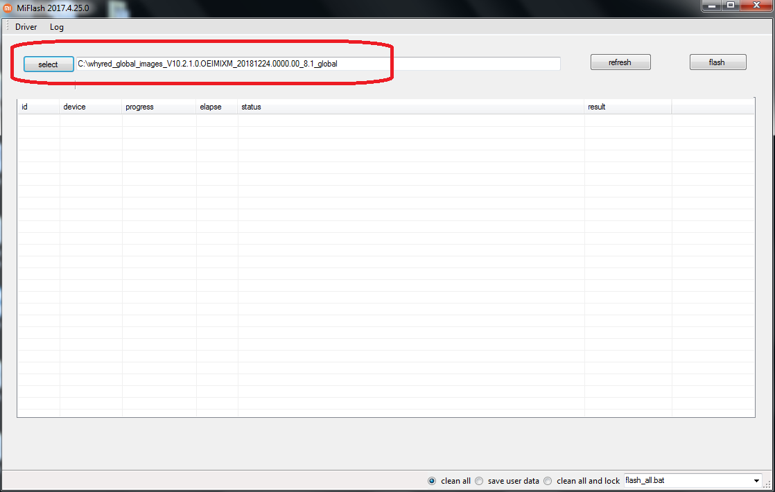 Αφού επιλέξουμε τον φάκελο της fastboot rom, θα βλέπουμε αυτό στο miflash