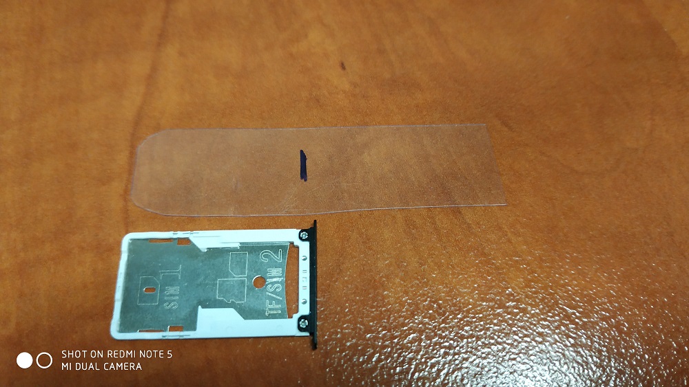 Για την προσπάθεια απεμπλοκής θα χρειαστούμε ένα ελαστικό έλασμα, αρκετά λεπτό αλλά ταυτόχρονα και αρκετά σκληρό...προσωπικά χρησιμοποίησα πλαστικό κάλυμμα βιβλιοδεσίας και έκοψα ένα κομμάτι, το οποίο το διαμόρφωσα στη διάσταση της υποδοχής του sim tray του κινητού