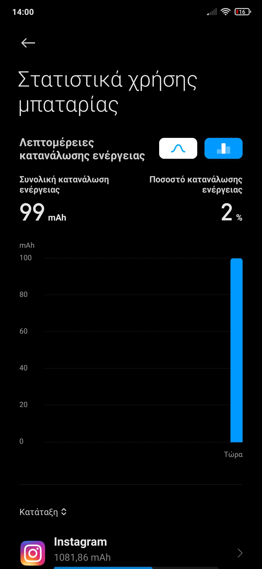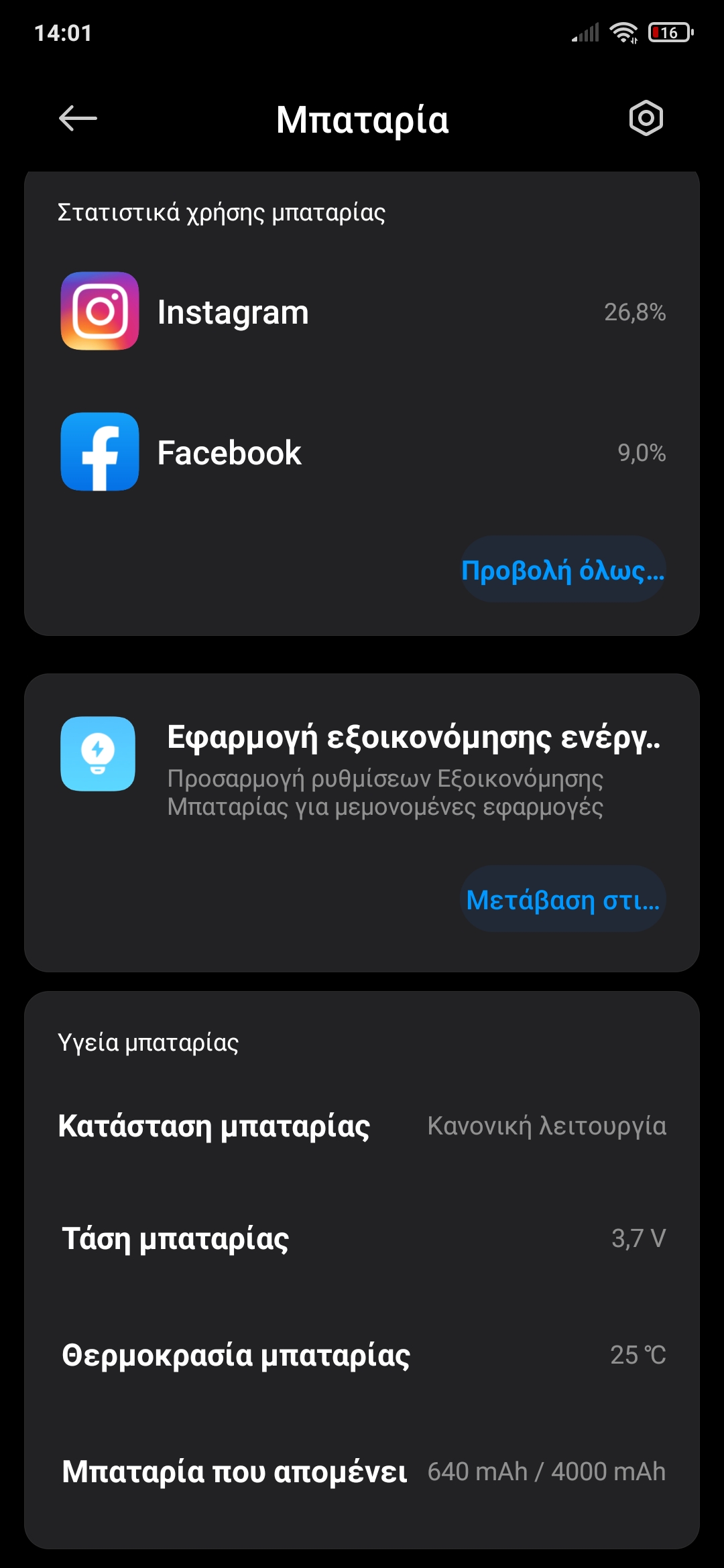 Οι Φωτογραφιες απο την χρηση μπαταριας που μου ζητησατε. Αυτη τη στιγμη οπως βλεπετε ειναι στο 16%, και πριν απο 4 ημερες το φορτισα εως το 100%. Την 2η ημερα ειδα μια πτωση απο το 80% που ηταν, μου πηγε την ιδια ημερα στο 42% με μια χρηση 2 ωρων συνεχωμενης χρησης. Απο εκει και περα 5- λεπτα απο την 3η και 4η ημερα, εως και σημερα στο τελικο αποτελεσμα της μπαταριας. Παρατηρω οτι την μεγαλυτερη καταναλωση μου την κανει το Instagram, και οπως βλεπετε στις φωτογραφιες, θεωρειτε φυσιολογικο να κανει τετοια καταναλωση? Επισης εκανα μια απεγκατασταση το Instagram/Facebook/Messenger, και τα ξαναπερασα παλι. Εαν μου προτεινετε να κανω Επαναφορα Εργ. Ρυθμισεων, ή FactoryHard Reset, τι ειναι καλυτερο για το κινητο και για την μπαταρια απο τα 2 αυτα? -