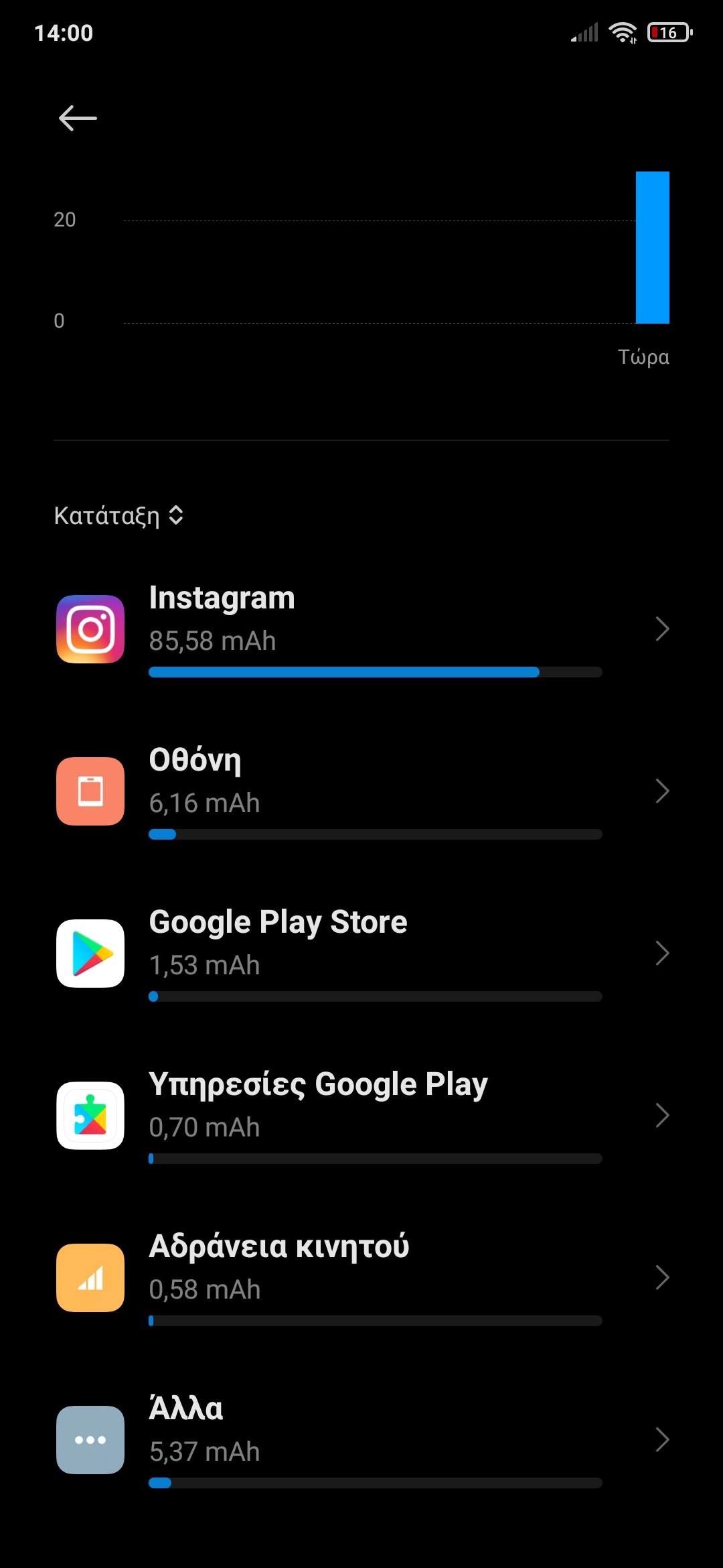 Οι Φωτογραφιες απο την χρηση μπαταριας που μου ζητησατε. Αυτη τη στιγμη οπως βλεπετε ειναι στο 16%, και πριν απο 4 ημερες το φορτισα εως το 100%. Την 2η ημερα ειδα μια πτωση απο το 80% που ηταν, μου πηγε την ιδια ημερα στο 42% με μια χρηση 2 ωρων συνεχωμενης χρησης. Απο εκει και περα 5- λεπτα απο την 3η και 4η ημερα, εως και σημερα στο τελικο αποτελεσμα της μπαταριας. Παρατηρω οτι την μεγαλυτερη καταναλωση μου την κανει το Instagram, και οπως βλεπετε στις φωτογραφιες, θεωρειτε φυσιολογικο να κανει τετοια καταναλωση? Επισης εκανα μια απεγκατασταση το Instagram/Facebook/Messenger, και τα ξαναπερασα παλι. Εαν μου προτεινετε να κανω Επαναφορα Εργ. Ρυθμισεων, ή FactoryHard Reset, τι ειναι καλυτερο για το κινητο και για την μπαταρια απο τα 2 αυτα? -