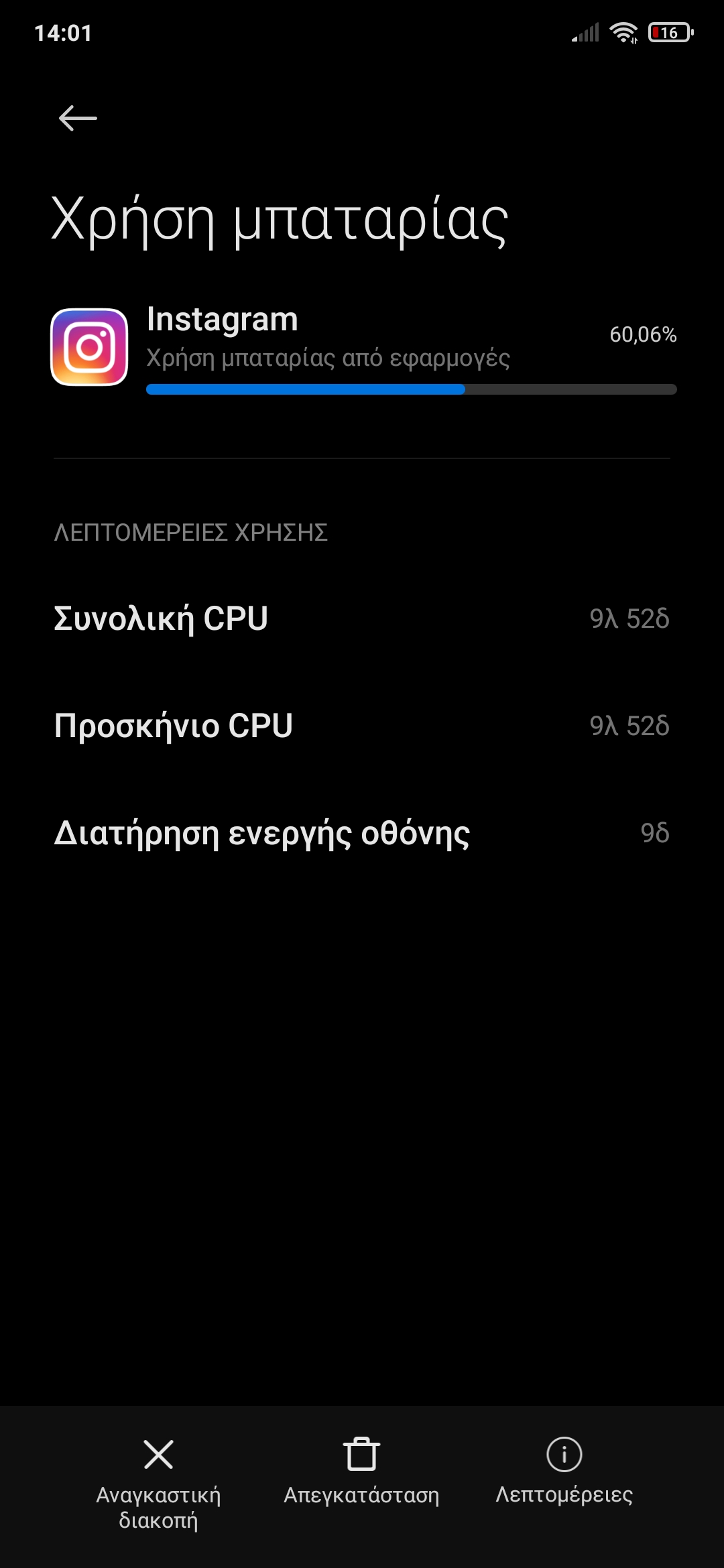 Οι Φωτογραφιες απο την χρηση μπαταριας που μου ζητησατε. Αυτη τη στιγμη οπως βλεπετε ειναι στο 16%, και πριν απο 4 ημερες το φορτισα εως το 100%. Την 2η ημερα ειδα μια πτωση απο το 80% που ηταν, μου πηγε την ιδια ημερα στο 42% με μια χρηση 2 ωρων συνεχωμενης χρησης. Απο εκει και περα 5- λεπτα απο την 3η και 4η ημερα, εως και σημερα στο τελικο αποτελεσμα της μπαταριας. Παρατηρω οτι την μεγαλυτερη καταναλωση μου την κανει το Instagram, και οπως βλεπετε στις φωτογραφιες, θεωρειτε φυσιολογικο να κανει τετοια καταναλωση? Επισης εκανα μια απεγκατασταση το Instagram/Facebook/Messenger, και τα ξαναπερασα παλι. Εαν μου προτεινετε να κανω Επαναφορα Εργ. Ρυθμισεων, ή FactoryHard Reset, τι ειναι καλυτερο για το κινητο και για την μπαταρια απο τα 2 αυτα? -