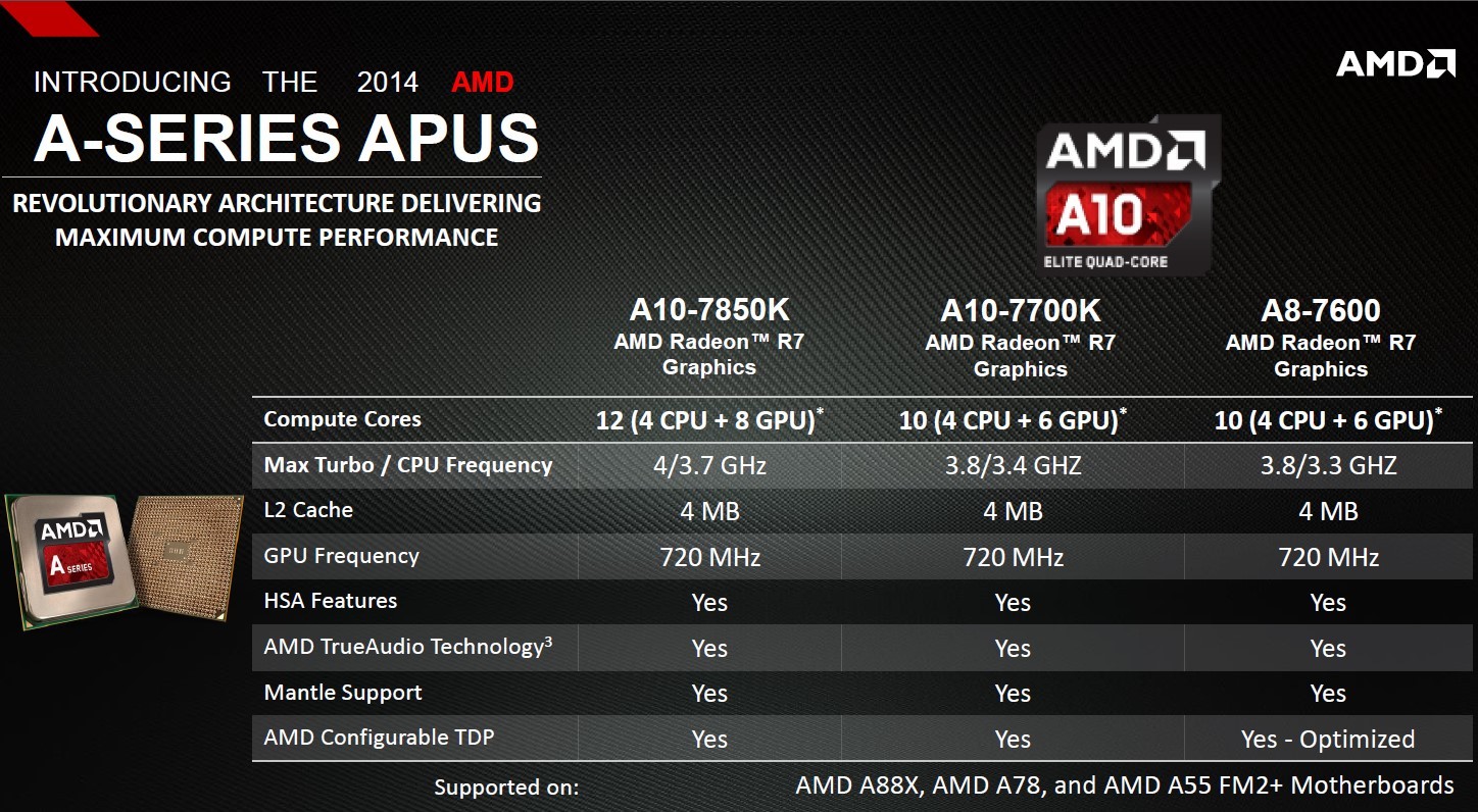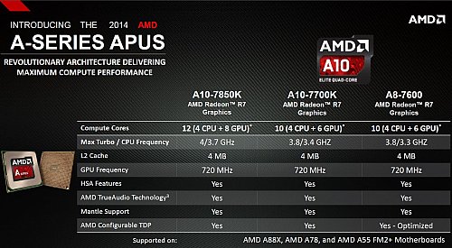 Για την ωρα έχουν ανακοινωθεί τρία μοντέλα (A10-7850K, A10-7700K και A8-7600) που θα αποτελέσουν μέρος της νέας αυτής σειράς, τα τεχνικά χαρακτηριστικά των οποίων μπορείτε να δείτε στην εικόνα που ακολουθεί παρακάτω.