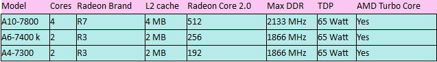 Συγκεκριμένα στα σχέδια είναι η διάθεση του τετραπύρηνου A10-7800 που αποτελεί ένα «κλειδωμένο» Kaveri APU με γραφικά R7 Radeon, 4 MB μνήμης L2 Cache, ενώ το TDP διαμορφώνεται στα 65W και ο χρονισμός της μνήμης ανέρχεται στα 2133 Mhz. Στη συνέχεια έχουμε τα διπύρηνα A6-7400k και A4-7300 τα οποία απευθύνονται για την αγορά των HTPC, καθιστώντας τα ως την πιο ιδανική λύση για τέτοιου είδους συστήματα. Η μνήμη cache αγγίζει τα 2 MB μόλις ενώ το TDP διαμορφώνεται στα 65W.