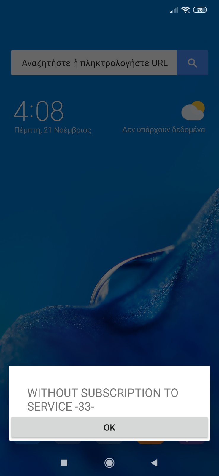 Καλησπέρα σε όλους. Έχω ένα πρόβλημα στο Redmi Note 8 Pro. Μου εμφανίζει συνεχώς το μήνυμα "WITHOUT SUBSCRIPTION TO SERVICE -33-". Έχετε καμία λύση; Είμαι έτοιμος να γυρίσω πίσω το κινητο.