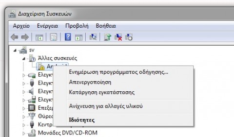 Κάνε δεξι στο android που βλεπεις και επέλεξε οδηγό "bootloader "από την λίστα που θα σου εμφανίσει αν ειναι σε fastboot mode το κινητο.