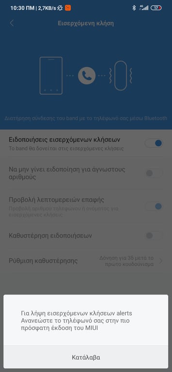Στις ρυθμίσεις του Mi-fit για τις εισερχόμενες κλήσεις μου εμφανίζει αυτό το μύνημα (επισυνάπτω και μια φωτογραφία):