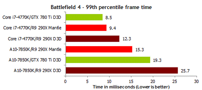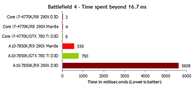 Βλέπουμε ότι σε περιπτώσεις GPU Bound, το Mantle δημιουργεί μια διαφορά των 12 frames, ενώ σε περιπτώσεις CPU Bound η διαφορά αγγίζει τα 41 frames. Ακόμη παρατηρούμε ότι στην περίπτωση του CPU Bound η 780 Ti συμπεριφέρεται καλύτερα από την R9 290X, όχι όμως και όταν χρησιμοποιείται το Mantle. Επιπλέον σε κατάσταση GPU Bound, το Mantle βοηθάει την R9 290X να φθάσει την 780 Ti με μια διαφορά που ανέρχεται μόλις στα 15 frames.