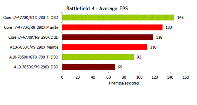 Βλέπουμε ότι σε περιπτώσεις GPU Bound, το Mantle δημιουργεί μια διαφορά των 12 frames, ενώ σε περιπτώσεις CPU Bound η διαφορά αγγίζει τα 41 frames. Ακόμη παρατηρούμε ότι στην περίπτωση του CPU Bound η 780 Ti συμπεριφέρεται καλύτερα από την R9 290X, όχι όμως και όταν χρησιμοποιείται το Mantle. Επιπλέον σε κατάσταση GPU Bound, το Mantle βοηθάει την R9 290X να φθάσει την 780 Ti με μια διαφορά που ανέρχεται μόλις στα 15 frames.