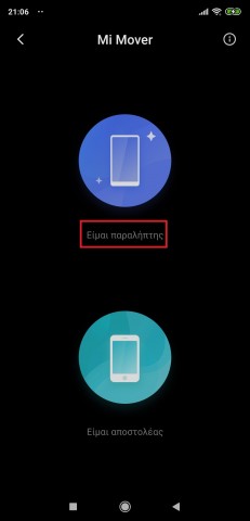 1. Πηγαίνουμε Ρυθμίσεις - Σχετικά με το τηλέφωνο - Μετακινητής Mi. Ανοίξτε την εφαρμογή και στα δύο τηλέφωνα (Είμαι αποστολέας & Είμαι παραλήπτης) επιλέξτε "Είμαι αποστολέας" στο τηλέφωνο του αποστολέα και "Είμαι παραλήπτης" στο τηλέφωνο του παραλήπτη.