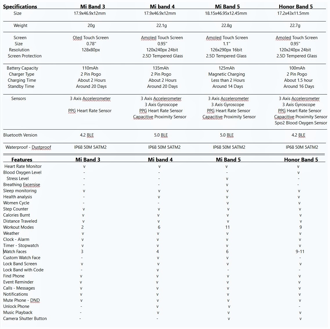Λεπτομερής Σύγκριση για τα Xiaomi Mi Band 3, Mi Band 4, Mi Band 5, και Honor Band 5