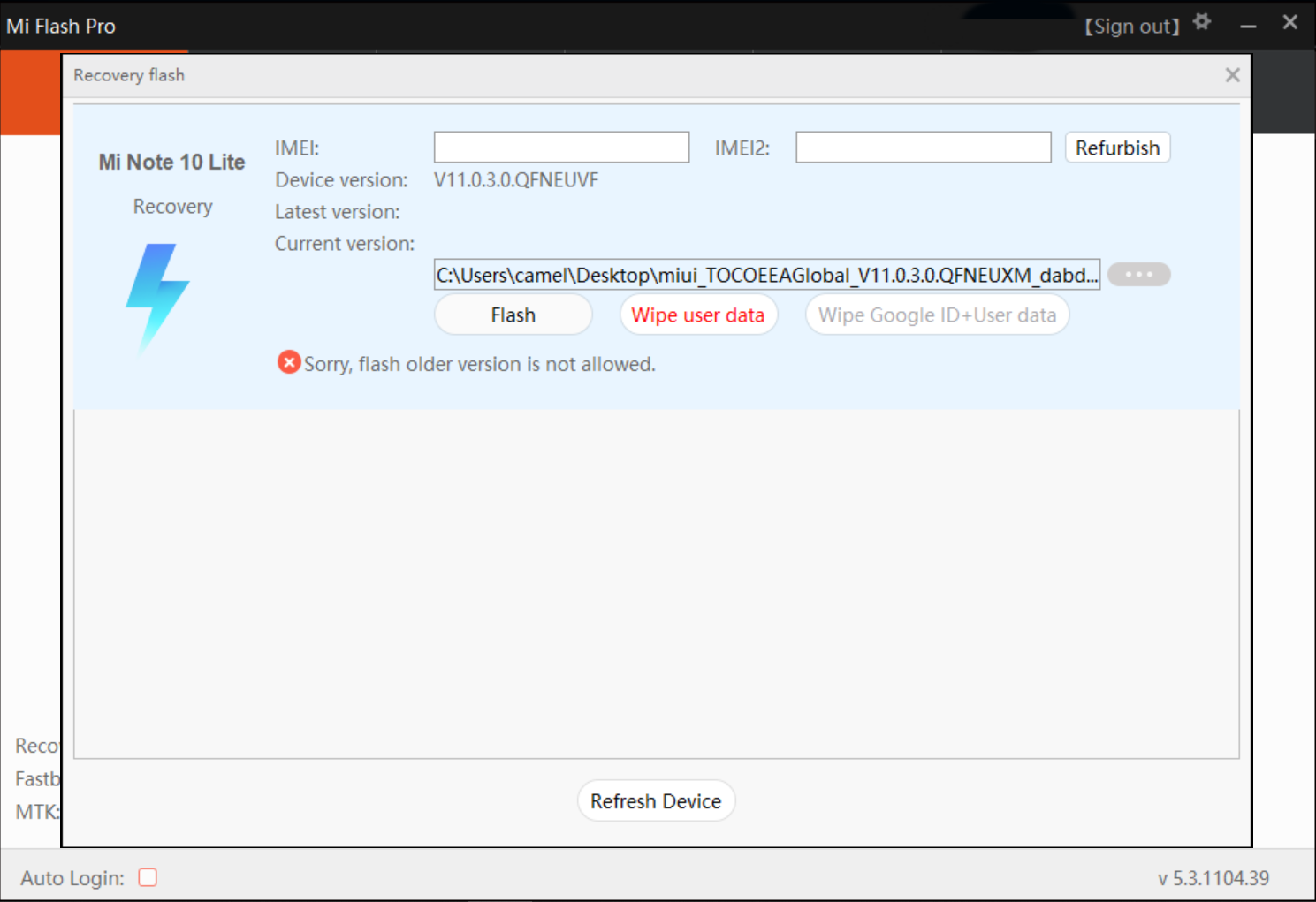 Μέχρι να μπορέσω να δοκιμάσω ξεκλείδωμα, είπα να προσπαθήσω μέσω recovery. Τα αποτελέσματα είναι τα παρακάτω. Προσπάθησα με όλες τις διαθέσιμες EU και όλες τις Global. Μέχρι και την πρώτη 12αρα μου βγάζει αυτό:Από την 12.0.3.0 και μετά μου βγάζει αυτό:Εχετε καμμία ιδέα γιατί μπορεί να συμβαίνει αυτό; Το κινητό σε recovery φαίνεται ως Android ADB Interface και έχω κάνει update το miflash pro στην τελευταία έκδοση