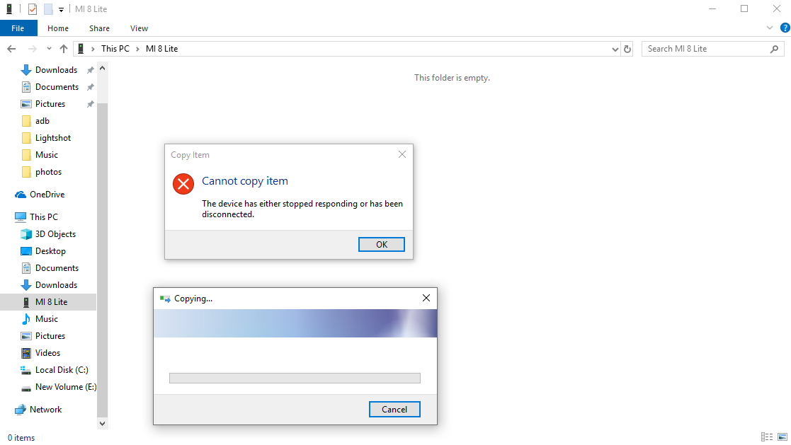 Στο ένα παράθυρό λέει the device has either stop responding or has been disconnected και στο δεύτερο παράθυρο λέει copying αλλά δεν φορτώνει τίποτα και μένει έτσι