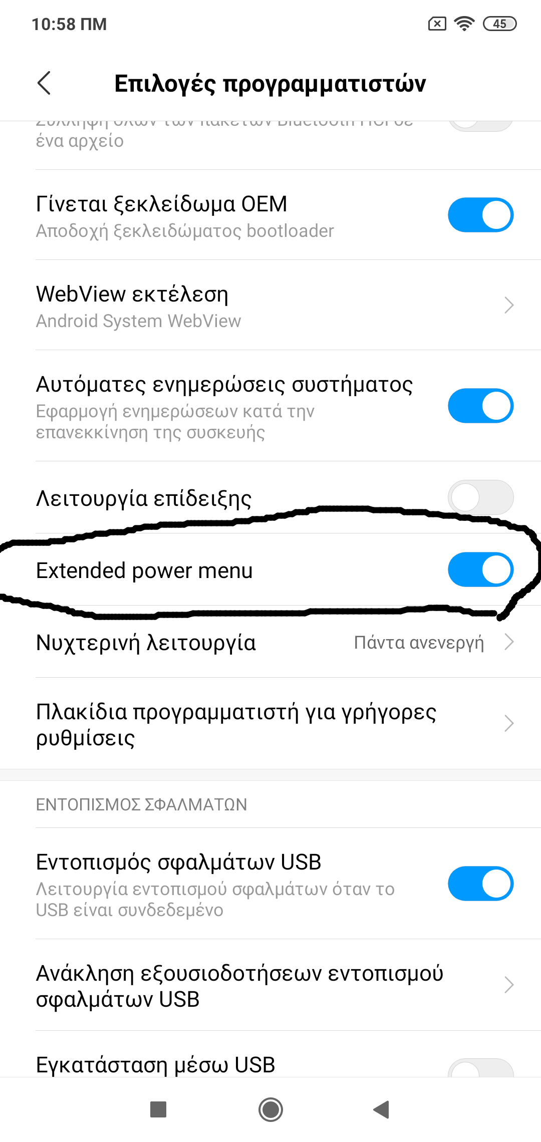 Ενεργοποίησε τις ρυθμίσεις προγραμματιστών όπως σου λένε παραπάνω μετά πας στο επιπλέον ρυθμίσεις / επιλογές προγραμματιστών και επιλέγεις την ρύθμιση extended power menu. Αφού το κάνεις αυτό μετά όταν πατάς επάνω στο reboot τότε θα εμφανίζονται οι 2 extra επιλογές fastboot ή recoveryΓενική συζήτηση για το Redmi Note 5 (Whyred)