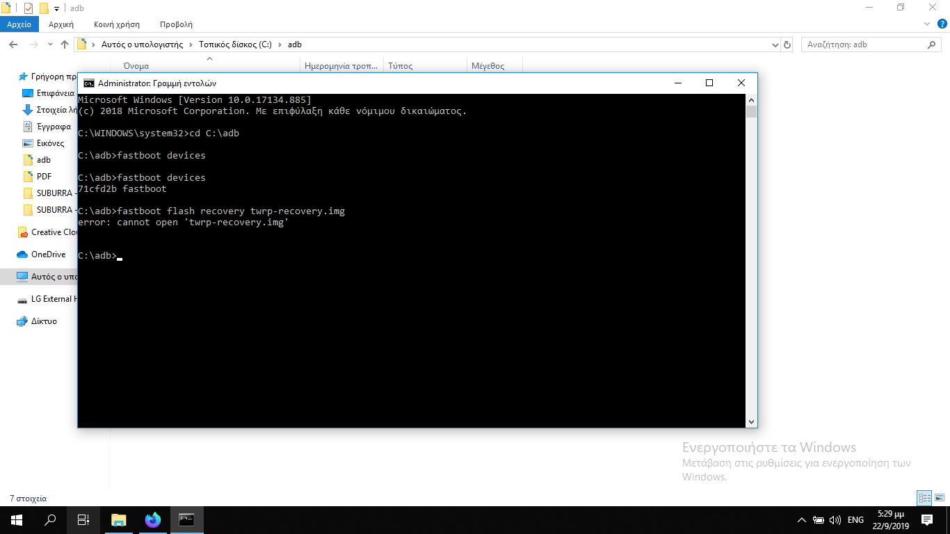 Ανέβασε screenshot από το σφάλμα και από τον adb φάκελο που περιέχει τα αρχεία σου και από το cmd παράθυρο εντολών.