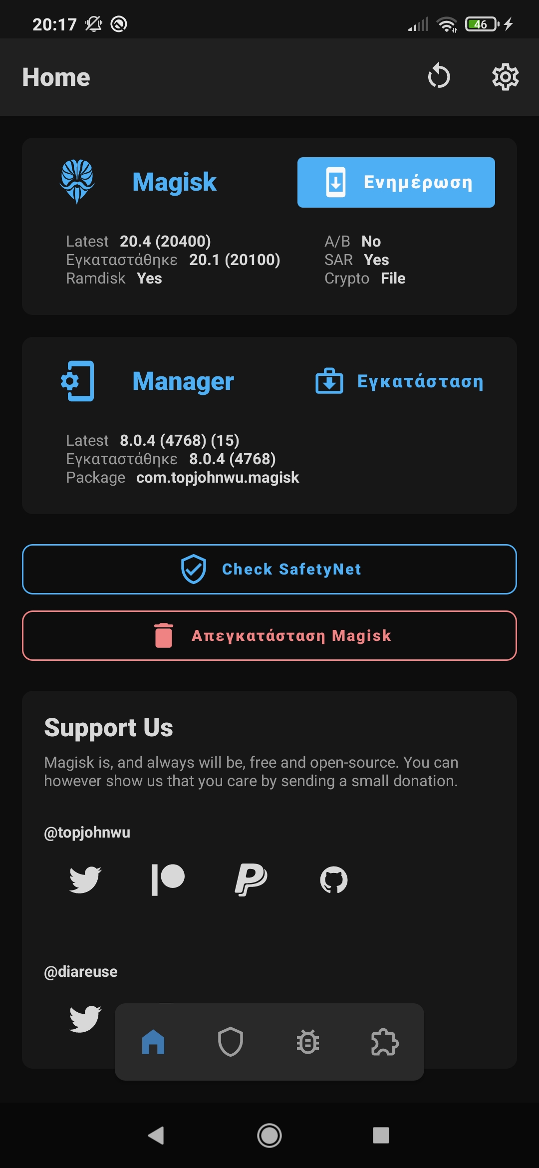*το μοναδικο προβλημα που εχω ειναι το εξης αλλα χωρις αυτο να επηρεαζει την λειτουργια του κινητου στην αρχικη του magisk στα πρωτα αν δειτε λεει "εγκατασταση" και στον manager και στο zip ενω τα εχω κανει κανονικα και χωρις κανενα προβλημα μεσω twrp συνεχιζει το ιδιο..