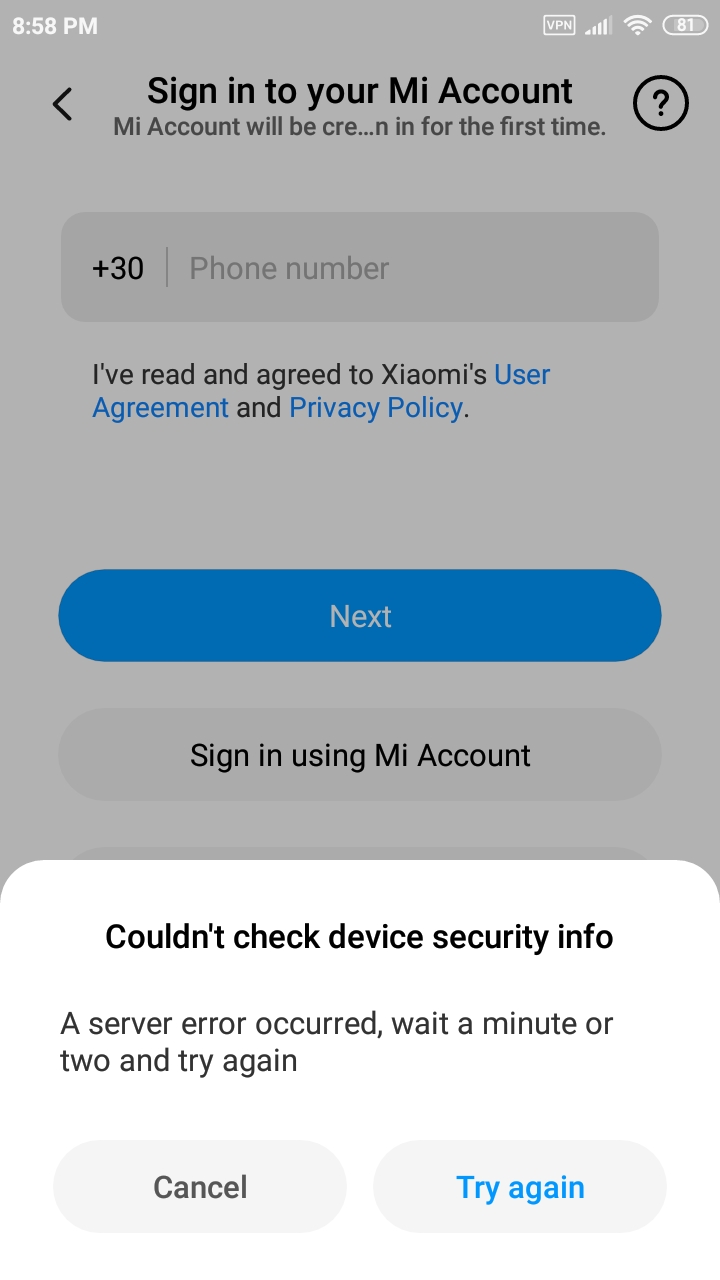 Αδυναμία σύνδεσης σε Mi Account (Server Error)