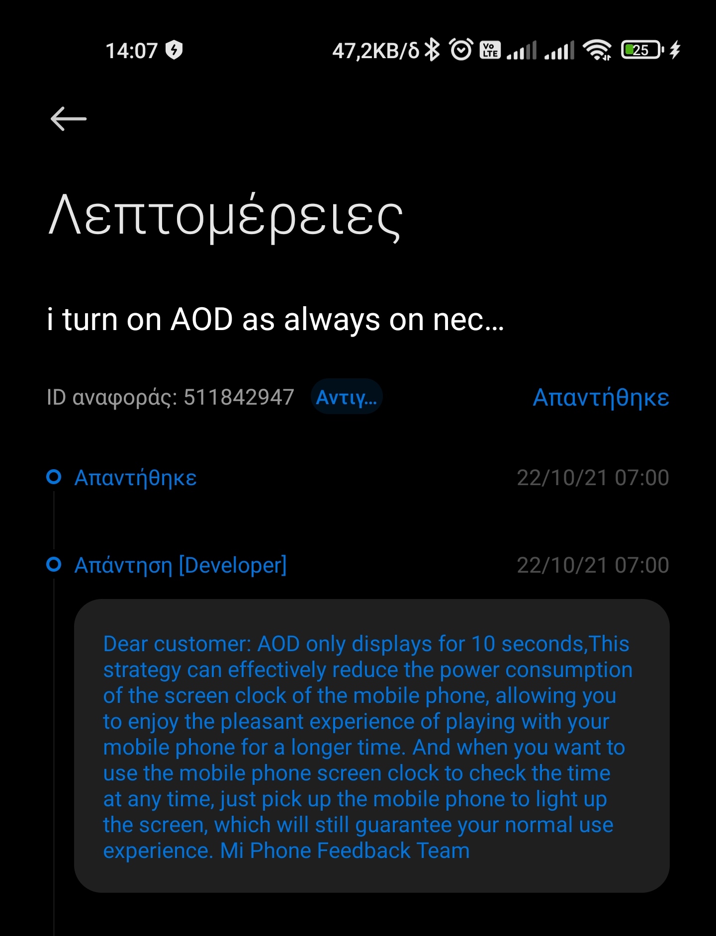 Επίσης επειδη με την AOD οταν ειμαι σε σκοταδι μετα απο κανα 5λεπτο κλεινει ... ενω πχ στο mi note 10 δεν μου κλεινει ποτε τους εστειλα ερωτηση και μου εδωσαν την παρακατω απαντηση ..