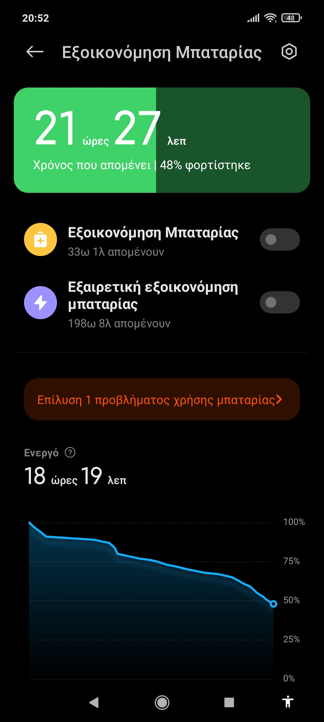 Διαπίστωσα όμως στις 3-4 πρώτες μέρες ότι ξεκινούσα τη μέρα μου στις π.χ. 09:00 το πρωί με 100% μπαταρία και μέχρι τις 17:00 το απόγευμα ήταν στο 20-35%, πράγμα απογοητευτικό καθώς το Mi Max 3 που είναι ήδη 3 ετών σχεδόν βάζει άνετα μια ολόκληρη μέρα και νύχτα με τις ίδιες ρυθμίσεις που αναφέρω, ενώ έχουν και τα δυο αρκετά μεγάλη μπαταρία (5500 vs 5100mAh)