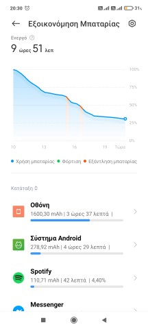 Εξοικονόμηση μπαταρίας ενεργή, WiFi-Bluetooth-Δεδομένα-GPS μόνο όταν χρειάζονται, και γενικότερα όχι τρομερή χρήση μέσα στη μέρα. Βασικές εφαρμογές για επικοινωνία και μουσική. Όχι παιχνίδια. Φωτεινότητα στο αυτόματο και οθόνη στα 60Hz.