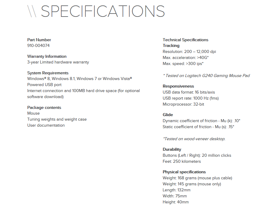 Το USB report rate αγγίζει τα 1000Hz ή αν προτιμάτε την αντιστοιχία 1ms και το ποντίκι διαθέτει 32-bit ARM επεξεργαστή. Επίσης υπάρχουν 11 προγραμματισμένα πλήκτρα και σε συνδυασμό με το Logitech Gaming Software, θα έχετε τον πλήρη έλεγχο στα παιχνίδια που θα σας συντροφεύσει.