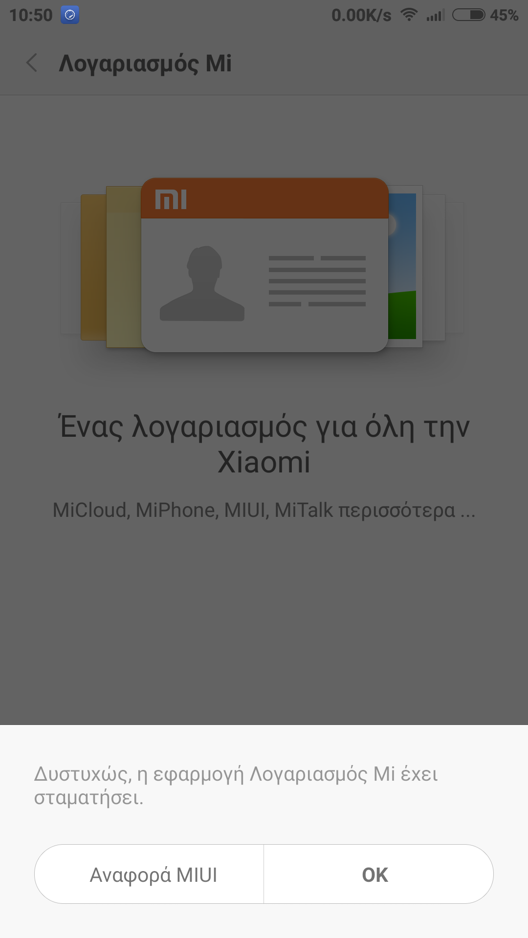 Καλημέρα σε όλους! Έχω 2 βδομάδες το MI4 και έχω βάλει αυτή την ΡΟΜ. Όμως, δε μπορώ να μπω για κανένα λόγο στο MI account, μου πετάει FC. Είναι bug, το έχει άλλος; Είτε μπω με αριθμό τηλεφώνου, με ID number είτε με email το ίδιο. Από το PC μπαίνω στο λογαριασμό, είναι σωστό το pass. Επίσης δε λειτουργεί ο Καιρός. Ενώ έχω internet λέει δεν είναι δυνατή η σύνδεση με το δίκτυο. Καμιά ιδέα;;; Ευχαριστώ!