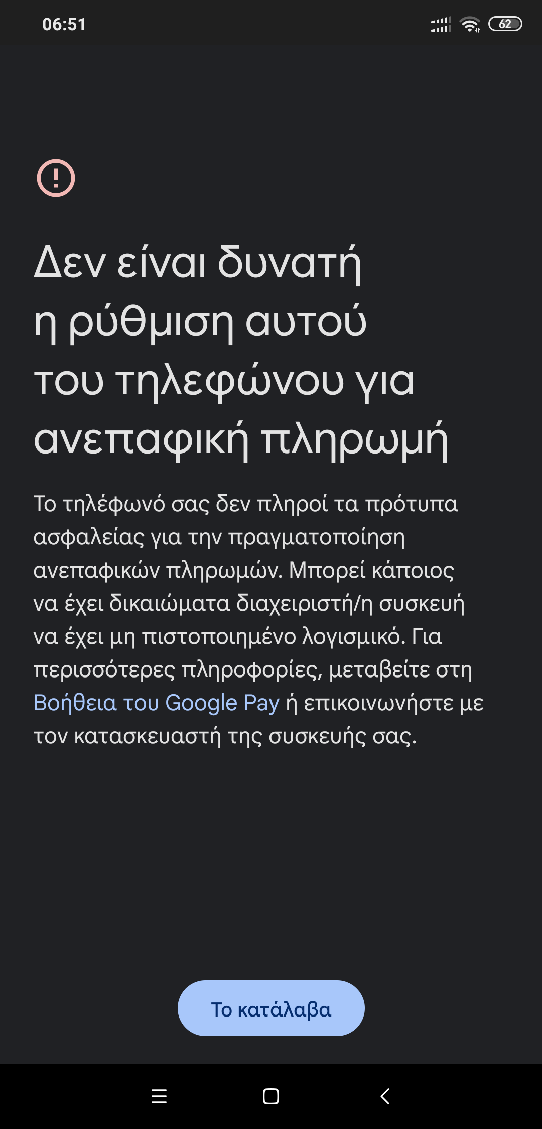 Καλησπερα παιδια, δεν μπορω να προσθεσω τις καρτες μου στο gpay και μου πεταει το μηνυμα που θα δειτε στην εικονα. Το κινητο ειναι το mi8 και miui 10.4 by xiaomi-miui.gr 9.5.9 beta . Υπαρχει τροπος να φτιαξει χωρις να χασω τα αρχεια μου?