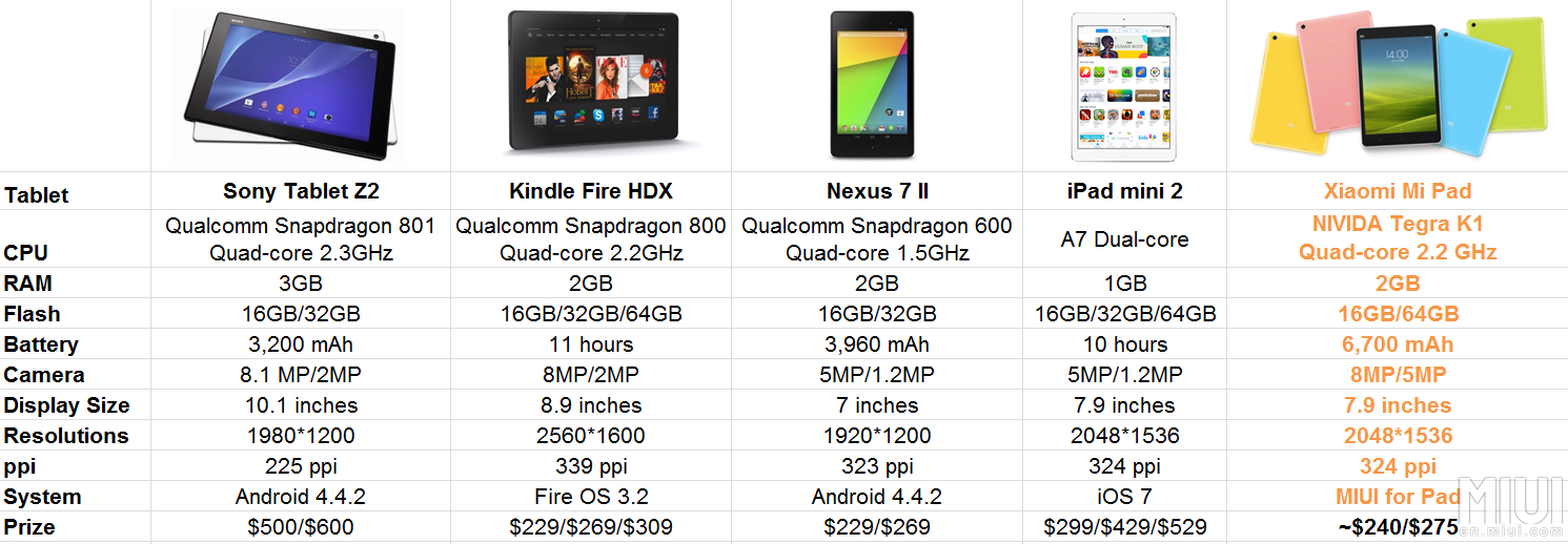 Εδώ είναι μια σύγκριση των specificiations του Xiaomi Mi Pad vs άλλων δημοφιλών PAD στην αγορά.