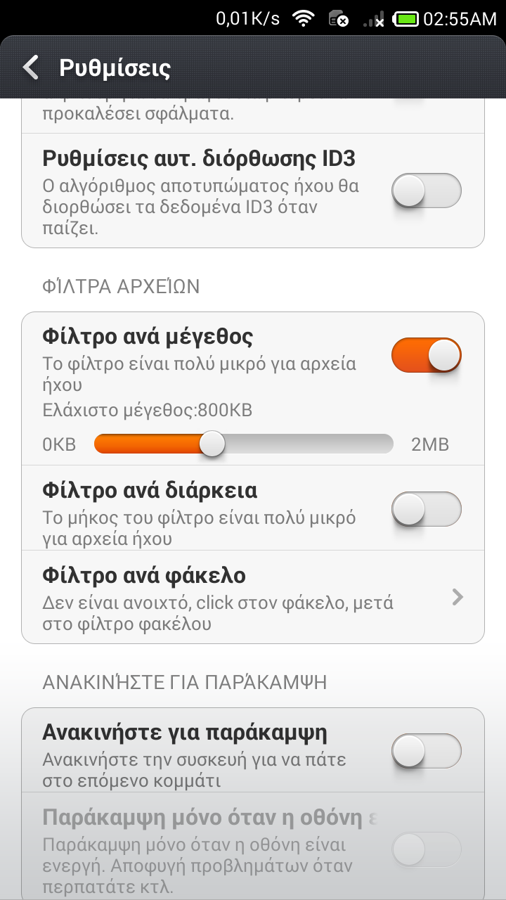 Πηγαίνεις Μουσική => Ρυθμίσεις => Φιλτρο ανά μέγεθος