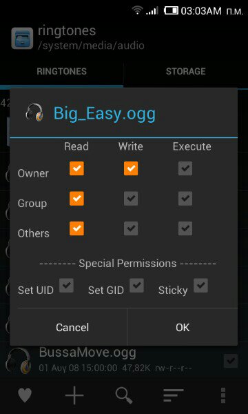 gkalen:Tι αρχειο ειναι αυτο που λες ??Ειναι mp3 η κατι αλλο ???Επισης να ξερεις οτι τον φακελο MIUI και να τον σβησεις ολοκληρο , θα ξαναδημιουργηθει μετα απο reboot.Τα τραγουδια μου τα'χω σ'ενα φακελο Music , στην sd και τα βρισκει ολα.Μαλλον κανεις λαθος στο αρχειο ηχου που θες να βαλεις για ringtone η το αρχειο ειναι σωστο αλλα το βαζεις σε λαθος φακελο.Αν θες να βαλεις το τραγουδι σου στο φακελο των ringtones , τοτε πρεπει να πας με root explorer , στο φακελο system/media/audio/ringtones/ ... και να βαλεις το τραγουδι στο φακελο /ringtones .... μετα απ'αυτο πρεπει να δωσεις permissions ( rw-r--r-- ) , στο αρχειο τραγουδιου για να μπορει να δουλεψει , αρκει να βαλεις τα permissions οπως στο screenshot.Κοιτα και τα screenshots αν βοηθανε ...Στάλθηκε από το ZTE Blade V μου χρησιμοποιώντας Tapatalk