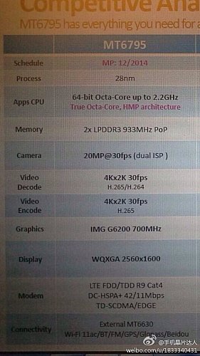 Το ποιο ενδιαφέρον μοντέλο όμως θα το δούμε στο τέλος του χρόνου. Πρόκειται για το MT6795, ένα 64bit SoC κατασκευασμένο στα 28nm που πιθανόν θα χρησιμοποιεί την big.LITTLE αρχιτεκτονική της ARM με τέσσερις πυρήνες A53 και τέσσερις Α57 και HMP(Heterogeneous Multi-Processing). Τα πλήρη τεχνικά του χαρακτηριστικά διέρρευσαν στο internet και μπορείτε να τα δείτε στην εικόνα που υπάρχει στο τέλος του άρθρου.