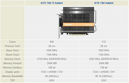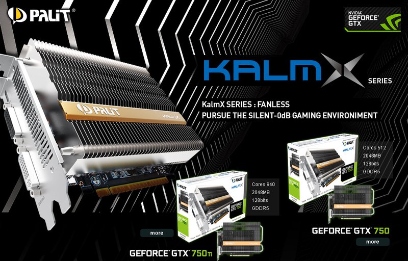 Η Palit Microsystems Ltd, ανακοίνωσε την διάθεση μιας νέας σειράς ονόματι KalmX η οποία αποτελείται από GeForxe GTX 750 Ti και GTX 750 μοντέλα, τα οποία χρησιμοποιούν ογκώδεις passive ψύξεις (χωρίς ανεμιστήρες) με δύο επινικελωμένα heat pipes, μεγάλο αριθμό fins και βάση από χαλκό για καλύτερη απαγωγή της θερμότητας. Η σειρά αυτή στοχεύει σε όσους επιθυμούν ένα όσο το δυνατόν ποιο ήσυχο περιβάλλον για gaming. Μάλιστα είναι οι πρώτες passive υλοποιήσεις στην αγορά που αξιοποιούν τα GTX750/GTX750Ti.