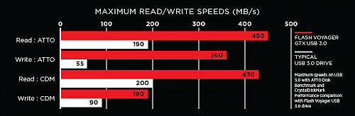 Η Corsair, μία από τις μεγαλύτερες εταιρίες κατασκευής υψηλών επιδόσεων εξαρτημάτων για υπολογιστές, ανακοίνωσε σήμερα την διαθεσιμότητα του Flash Voyager GTX USB 3.0, το οποίο είχε ανακοινωθεί στην Computex τον Ιούνιο. Διαθέσιμο σε χωρητικότητες των 128 GBκαι 256 GB, είναι το πιο γρήγορο flash drive που έχει κατασκευάσει ποτέ η Corsair. Οι υψηλές ταχύτητες, των 450 ΜΒ /s στην ανάγνωση και 350 ΜΒ/s στην εγγραφή δεδομένων, μειώνουν δραστικά τους χρόνους αναμονής όταν προσπαθείτε να αντιγράψετε ή να διαχειριστείτε μεγάλα αρχεία.