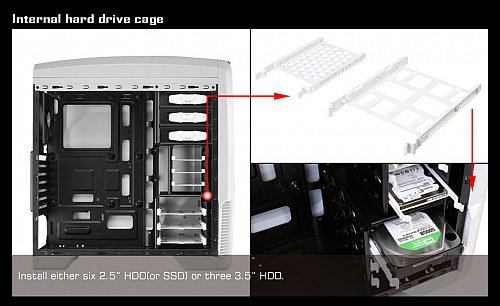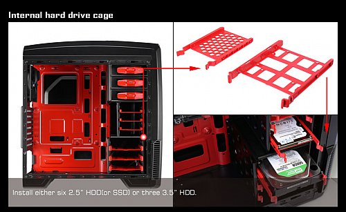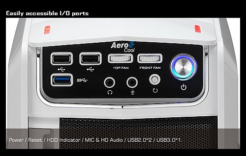 Η τοποθέτηση δίσκων είναι μια εύκολη υπόθεση με το ειδικό tool-free σύστημα της Aerocool. Υπάρχουν τρεις θέσεις για 5,25" συσκευές με ειδικά κλιπς για γρήγορη αφαίρεση. Υπάρχει πρόβλεψη για τοποθέτηση τριών 2.5" δίσκων και τρεις ακόμα θέσεις για 2,5" ή 3.5" δίσκους. Στο μπροστινό μέρος το οποίο ξεχωρίζει για τη φουτουριστική σχεδίαση, μπορείτε να εγκαταστήσετε μέχρι πέντε ανεμιστήρες. Η Aerocool έχει προεγκατεστημένους στο κουτί δύο ανεμιστήρες των 120 mm, έναν μπροστά και έναν πίσω. Και οι δύο περιστρέφονται στις 1.200 rpm με 36,4 CFM ροή αέρα και θόρυβο 26,5 dBA. Στην μπροστινή σχεδίασή του περιλαμβάνονται και κόκκινα LEDs τα οποία δίνουν μια όμορφή όψη σε συνδυασμό με τους ειδικούς αεραγωγούς που βοηθάνε στην ροή του αέρα. Το I/O panel διαθέτει μία USB 3.0 θύρα και δύο USB 2.0. Έχει επίσης υποδοχές για HD-audio και μικρόφωνο. Εκεί επίσης βρίσκονται και ο ρυθμιστής στροφών των δύο προεγκατεστημένων ανεμιστήρων.