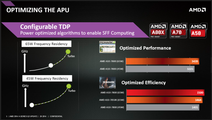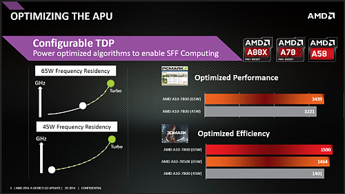 Και οι τρεις επεξεργαστές μοιράζονται ένα νέο ιδιαίτερο κοινό χαρακτηριστικό. Ο χρήστης μπορεί να ορίσει ο ίδιος την μέγιστη κατανάλωσή τους, είτε στα 45W, είτε στα 65W με μια απλή αλλαγή στο BIOS! Το αποτέλεσμα, όταν θέτει κάποιος την APU σε λειτουργία 45W, είναι μια μείωση της συχνότητας λειτουργίας της κάπου στα 400-500MHz, διατηρώντας όμως το Turbo. Σύμφωνα με την AMD οι επιδόσεις μειώνονται κάπου στα 6-7% στο PC Mark 8 και στο 3DMark, αλλά τα πλεονεκτήματα της μειωμένης κατανάλωσης σε SFF PCs και γενικότερα σε συστήματα χαμηλής κατανάλωσης, είναι ιδιαίτερα σημαντικά.