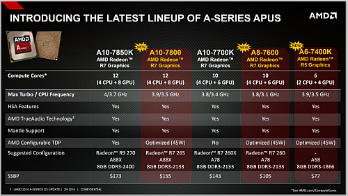 Όσον αφορά τα μοντέλα, ο A10-7800 διαθέτει τέσσερις Steamroller πυρήνες χρονισμένους στα 3.5GHz, 3.9GHz όταν ενεργοποιείται το Turbo. Η ενσωματωμένη κάρτα γραφικών του διαθέτει 512 GCN Radeon cores. Θα κοστίζει $155.