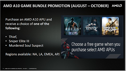 Τέλος, να πούμε ότι από τον Αύγουστο μέχρι τον Οκτώβριο θα τρέχει μια προσφορά της AMD. Με βάση αυτή, όποιος αγοράσει έναν Α10 APU θα μπορεί να πάρει δωρεάν ένα από τα Thief, Sniper Elite III, Murdered Soul Suspect.